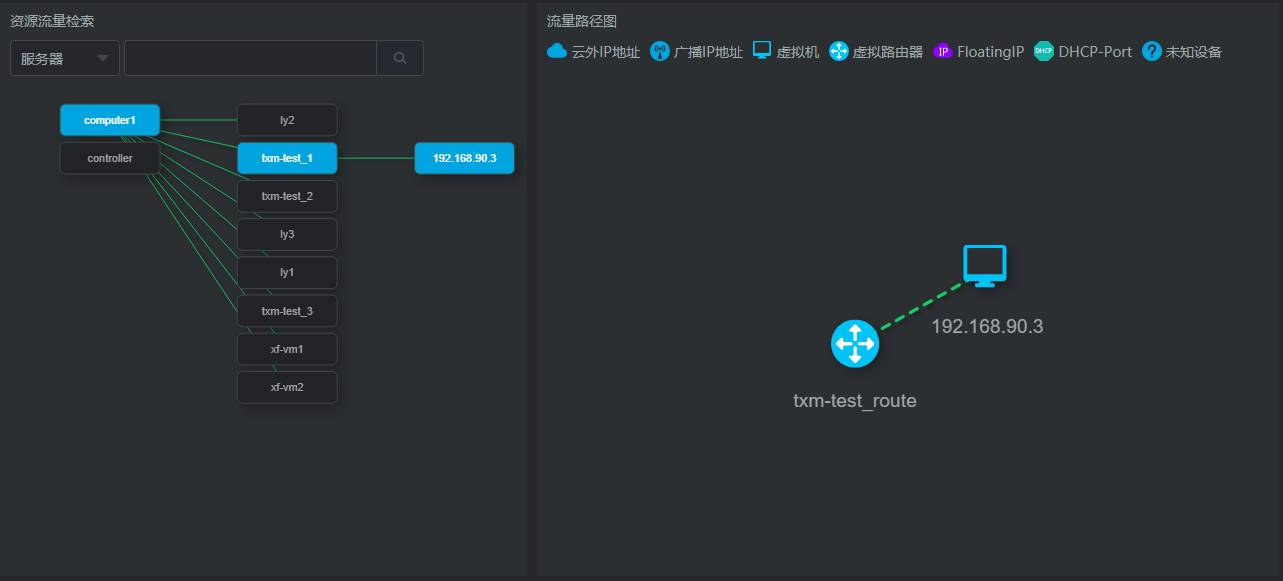3. 与该IP有网络通讯的其他网络元素将在拓扑图中清晰呈现,其关联的网络元素包括云外IP地址、广播IP地址、虚拟机、虚拟路由器、Floating IP、DHCP-Port,如果流量交互的设备未能识别,将标识为未知设备。