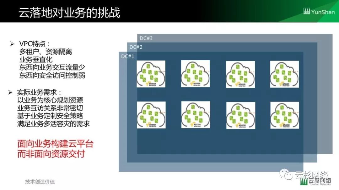 作为核心功能的网络编排面临几个挑战,首先对于现有的业务迁到云的时候如何满足既定业务上线要求?云网络部署架构很多场景是按照VPC设计的,规划VPC是首要考虑因素。其次是既有投资保护,不可能上了云以后将原来的设备全都废弃,需要考虑利旧问题。第三就是弹性扩展,如何在多数据中心之间实现资源弹性扩展,实现业务高可用。最后是业务的隔离,如何保证不同的业务之间有足够的安全防控手段。
