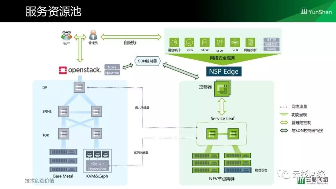 站在混合云数据中心管理和运营的角度来看,如何在保护原有设备资产投入的前提下兼容硬件设备和NFV、统一纳管多厂商多品类的网络和安全服务、化解硬件设备厂商绑定的问题的同时,给租户提供差异化的网络服务,即满足性能需求和服务交付的效率又能给用户带来更多的灵活性。